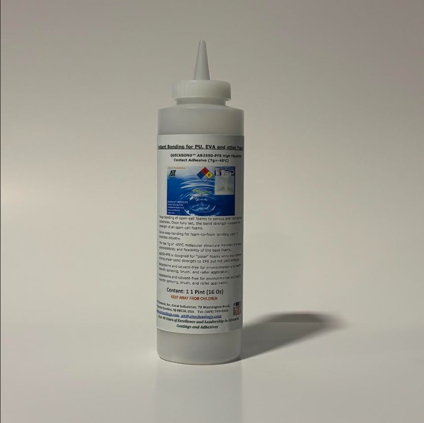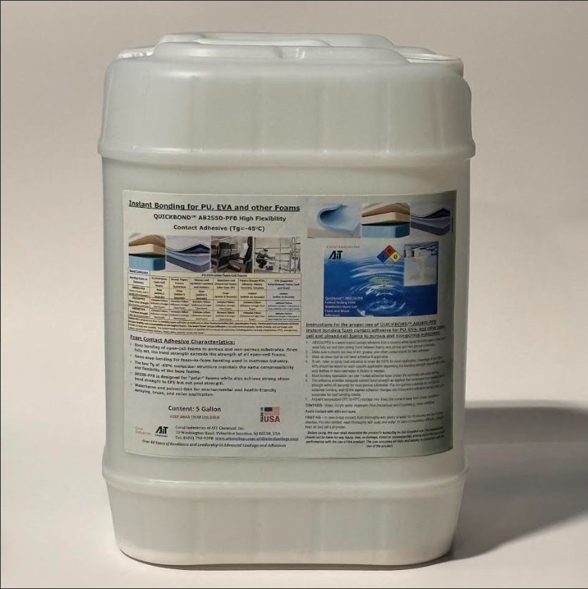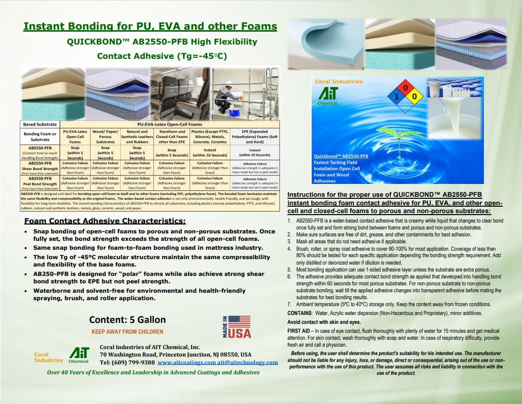 Quickbond™ AB2550-PFB is ideal for upholstery manufacturing, forming an instant bond for open cell foams to porous and non-porous substrates. This first-of-its-kind water-based contact cement allows for robust handling almost instantly within 5 seconds, along with unparalleled fast strength build-up that allows in-line production immediately after attachment.