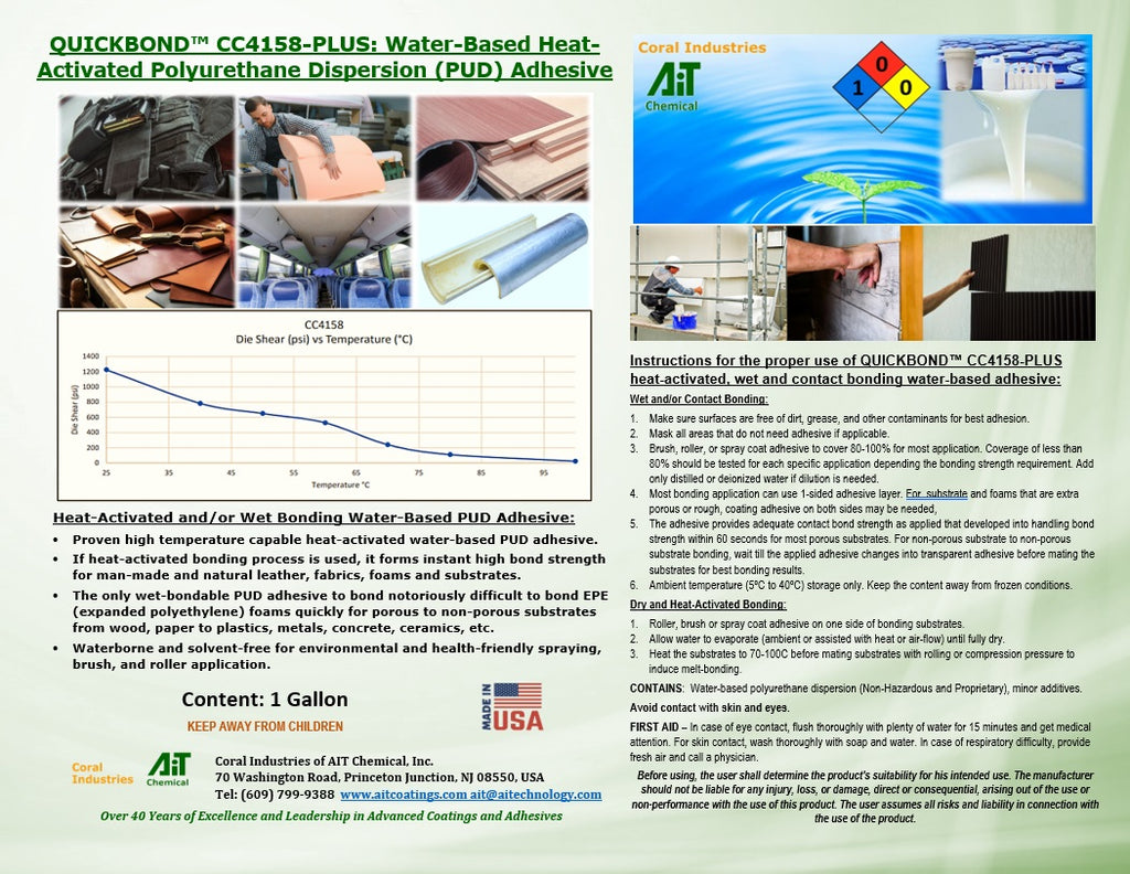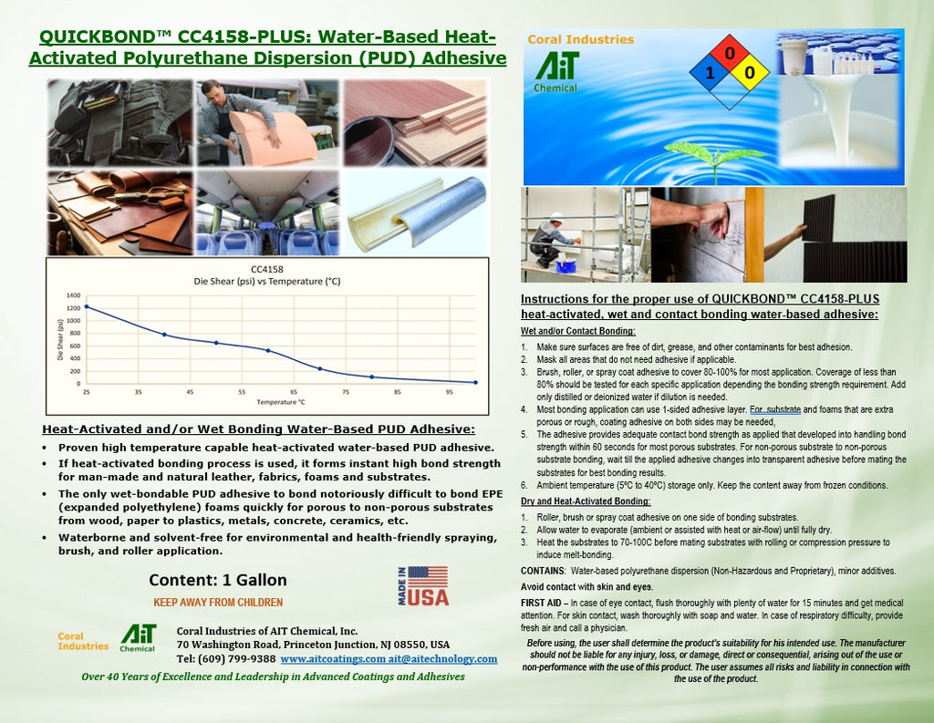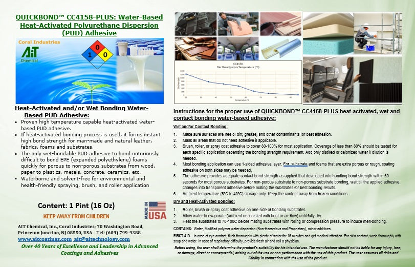 QUICKBOND™ CC4158-PLUS has been modified and enhanced from the original QUICKBOND™ CC4158 with expanded capability and compatibility to provide strong bonding to EPE, EPP and respective film and panel substrates of PE and PP.
